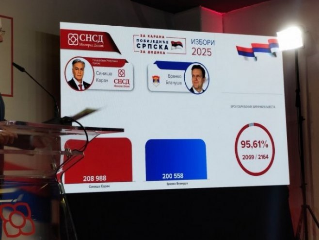 СрпскаЦИК: Синиша Каран нови предсједник Републике Српске (ФОТО)СрпскаКаран открио које ће првe кораке направити као предсједник Републике Српске (ВИДЕО)СрпскаЦвијановић: Велика побједа Српске, Карана и наше политичке породице предвођене ДодикомБиХКошарац Бабаљу: Ако ти је до тензија, иди у СарајевоСрпскаСНСД побједу Синише Карана прославља на улицама Бањалуке; Тробојке и сиренеСрпскаУ Власеници побиједио Синиша КаранСрпскаБлануша побиједио у ПрњаворуСрпскаБлануша: Излазност мања од очекиване (ВИДЕО)СрпскаРадуловић: СДС не признаје побједу СНСД (ВИДЕО)СрпскаКаран: По ко зна који пут када је најтеже побиједио је српски народ (ВИДЕО)