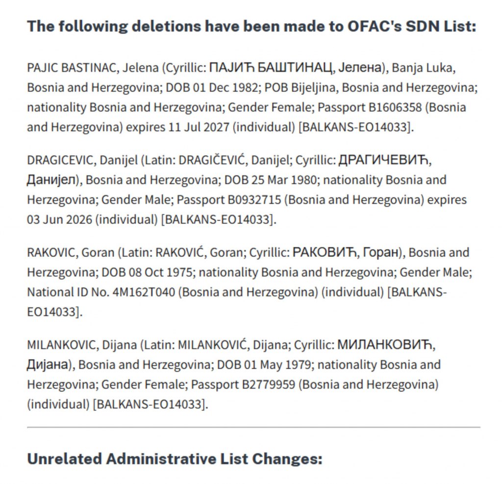 Министарство финансија САД-а је избрисало са листе санкционисаних Данијела Драгичевића, Јелену Пајић Баштинац, Горана Раковића и Дијану Миланковић, објављено је на званичној страници Министарства.