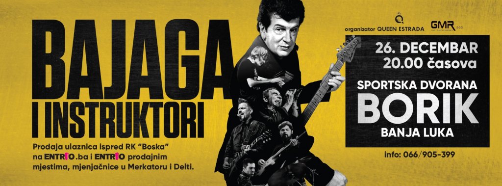 26. децембра ћемо имати прилику да у дворани Борик уживамо у свим великим хитовима Бајаге и инструктора насталих у пребогатој каријери бенда. Репертоар обухвата пјесме са свих 13 студијских абума, почевши од 1984. године и чувене "Позитивне географије" па до данашњих дана.