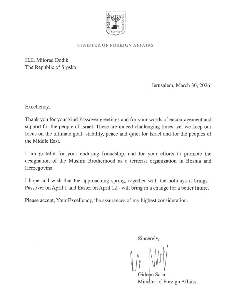 Министар спољних послова Израела Гидеон Сар захвалио је предсједнику СНСД-а Милораду Додику на честиткама поводом Песаха и ријечима охрабрења и подршке народу Израела.
